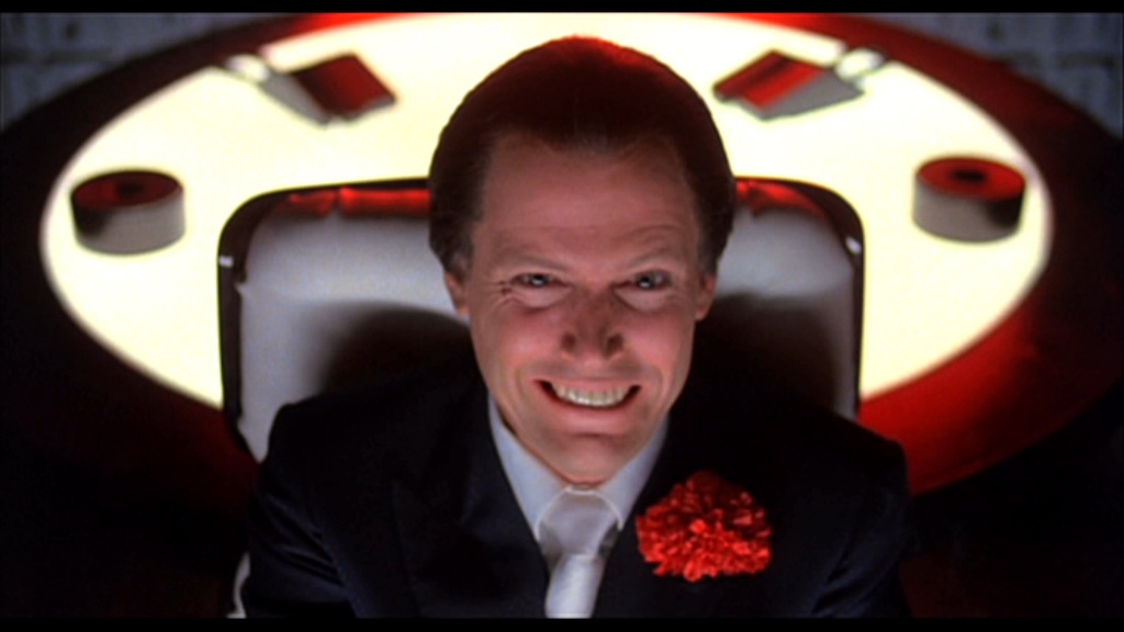 Not all of Denton TV’s shows remain on the air. One particular show, “The Denton Dossier,” is a talk show in which host Betty Hapschatt (Ruby Wax) interviews Denton’s leading social scientist, Judge Oliver Wright (Charles Gray). The judge criticizes the overly cheerful opening anthem (“Denton U.S.A”) as just another manipulative tactic to lure in the feeble-minded. Soon after this thinly veiled critique, the show is cancelled. The airwaves are no place to offer alternative viewpoints that fly in the face of the head sponsor. It’s not unlike banning members of the press from attending a rally because they once wrote something unfavorable about the candidate. One can’t help but notice that the Farley Flavors Fast Food commercial that airs afterwards has the brand logo—five F’s in a circle, eerily resembling another fascist symbol.