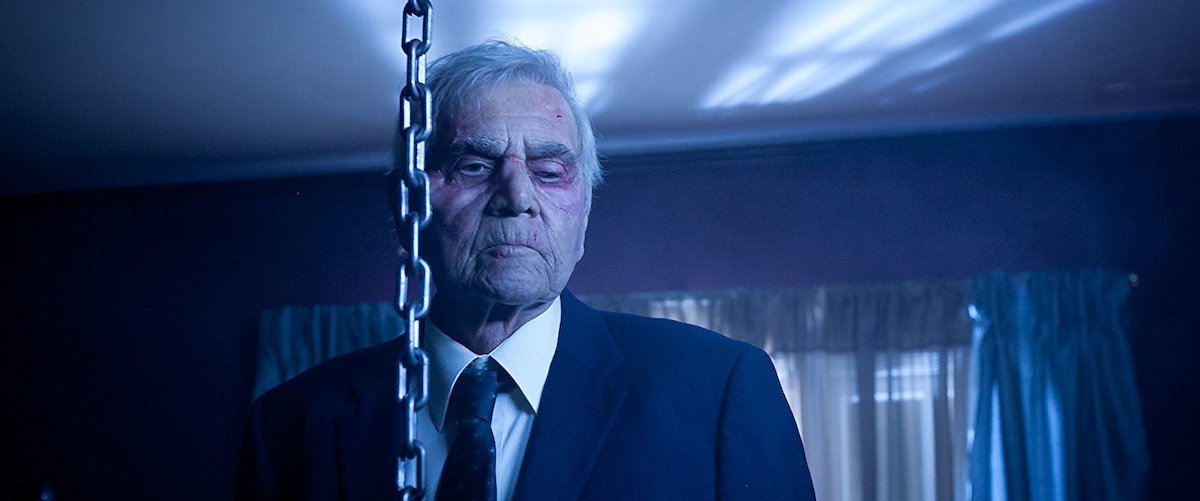 Zach’s unnecessarily convoluted story then fast-forwards several years into his future. He’s married now, and has moved into a new house with his beautiful wife Shawn (Charlbi Dean Kriek). At this time, Zach (now played by Dominic Sherwood) seems to have it all. We know this because secondary characters, like Dr. Summers, and Zach’s childhood friend Timmy (Andrew Caldwell), all tell him as much. Over and over, we are reminded: Zach earns good grades in law school, has a good relationship with next-door neighbors Jo and Vincent (Drea de Matteo and Alex Carter), and even has a great marriage. He apparently could not ask for anything more. That all changes around the time when Vincent’s father Mr. Marino (Alex Rocco) commits suicide. Zach starts to see his childhood double, a pale teenager cloaked in, um, a rather non-threatening hoodie. Zach is also haunted by images of a man being tortured on his laptop. Nobody believes Zach, or understands why he wants to remember, but he must know: what happened to him when he was a child, and why is it so boring?