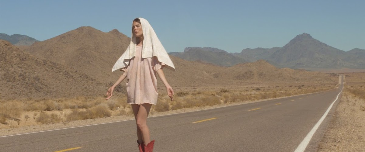 A woman (played by Rowlson-Hall) emerges from the desert in the American Southwest, stepping out onto the lonely blacktop. She wears a loose T-shirt, a white cloth draped over her head. The red of her cowboy boots is the only bright color, instantly calling to mind Dorothy's ruby slippers. Her face is dusty. Her eyes are a clear almost white-blue. It's a startling face. She's got a thousand-yard stare. She moves slowly, without recognizable human behavior. She is a marble statue far from her pedestal. A man (Andrew Pastides) driving along the road pulls to a stop when he sees her. He's got blazing blue eyes that match his blue shirt. He stares at her as though she is a mirage. She crawls onto the hood of his car, splaying herself across the hood and windshield in a pose of abjection. Since it appears that she will not be moving anytime soon, he drives that way to the nearest motel, his car pulling into the parking lot like a ship with a living figurehead on its prow.