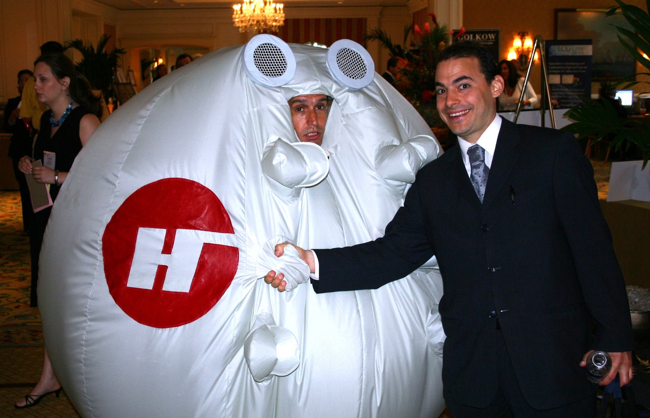 Consider the “SurvivaBall.” This is a fake survival suit, built by the Yes Men but presented as a new product from Halliburton. This is an inflated padded globe completely containing a human body, and round as a beach ball. Obviously, if you fell over, you’d have no way to stop yourself from rolling, or be able to stand up on your own. There’s a closable face opening, air filters, little extendable gloves and a port that, unless I miss my guess, is intended for extra-suit urination. It comes with the big red Halliburton trademark.